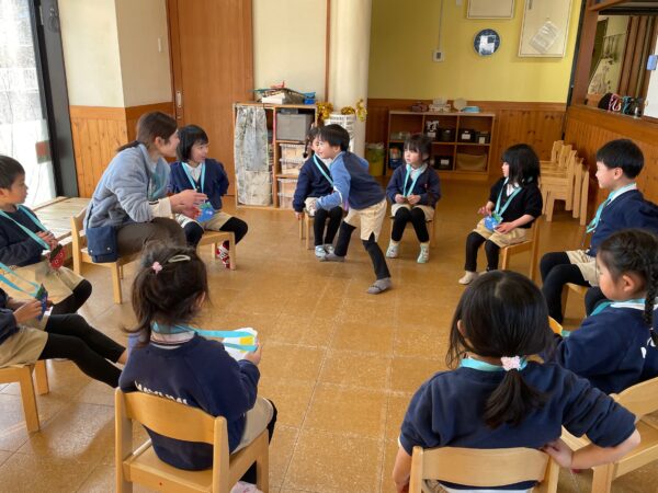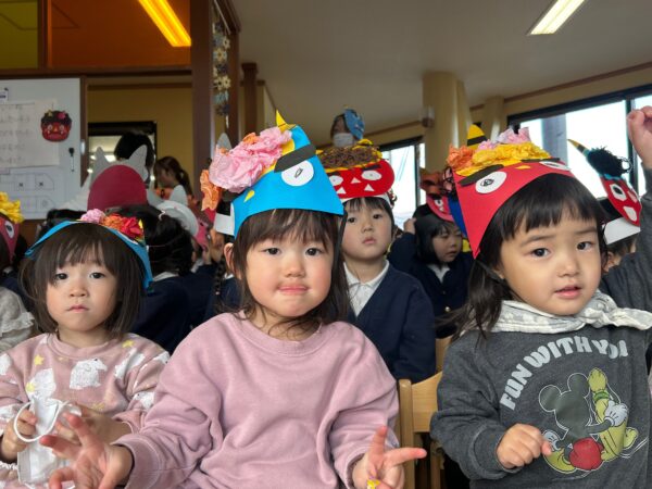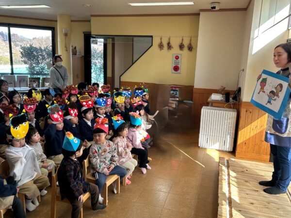 様々なお面をつけた子ども達が集まり、豆まき会の始まりです!!