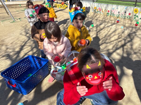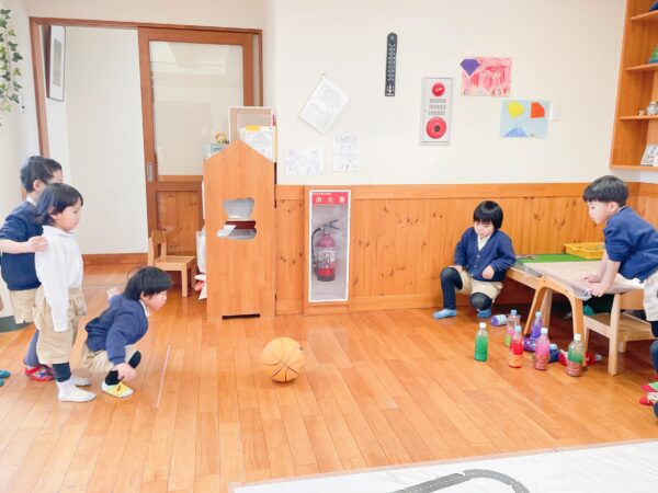 鬼が背負ったかごにボールを入れようと追いかけたり、フルーツバスケットならぬ「鬼バスケット」をしたり、ボーリングに輪投げ、どの遊びも盛り上がりました!