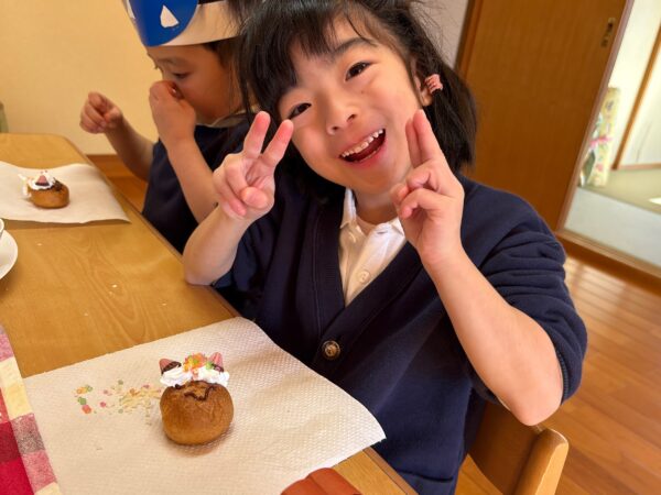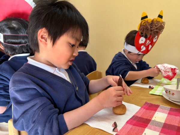 幼児部では鬼のシュークリームのクッキングも行い、可愛い鬼がたくさんできました。