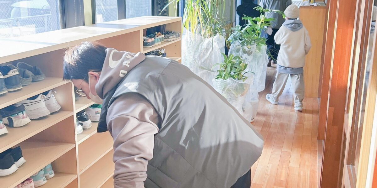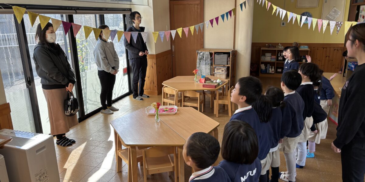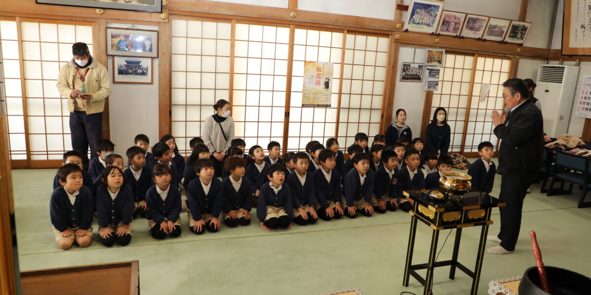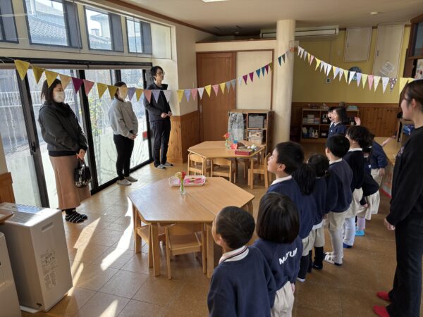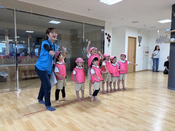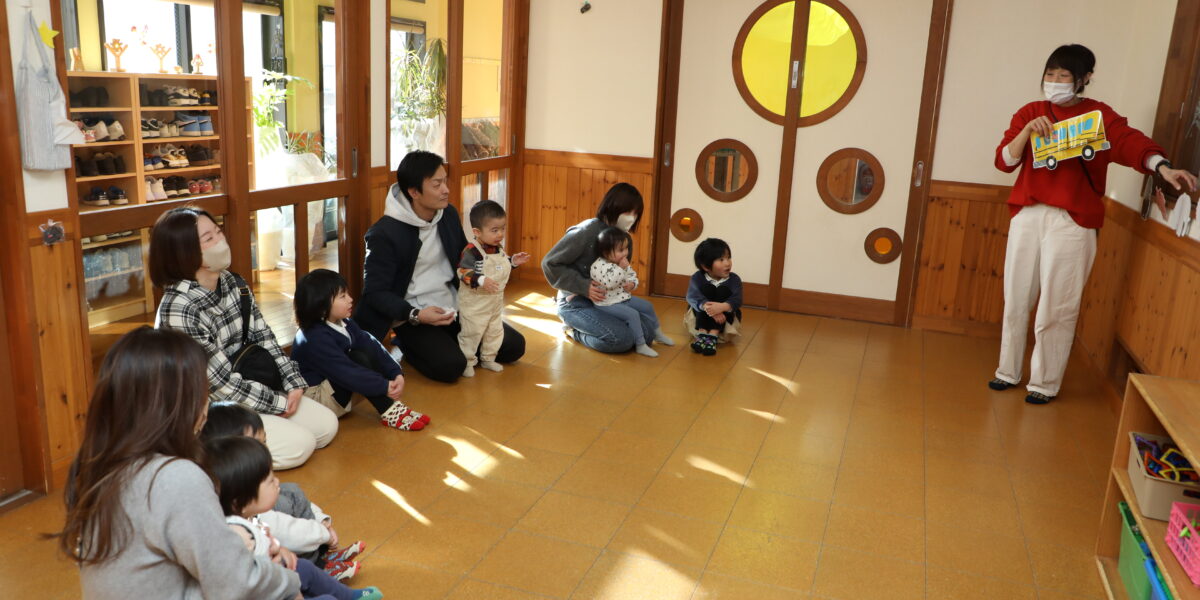 家庭的な園舎の唯一の直線廊下は、乳児と幼児を結ぶ「ふれあい」の場。ハイハイ競争やサーキット遊び場にも変化します。